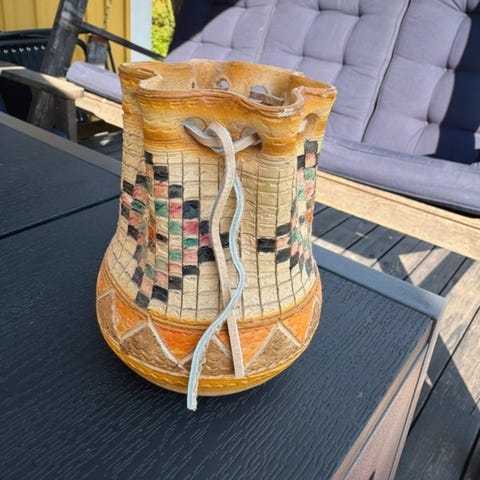 lucie kaas vas/kruka med guldkant. Vasens yta har en strukturerad finish och den är cylindrisk i formen.