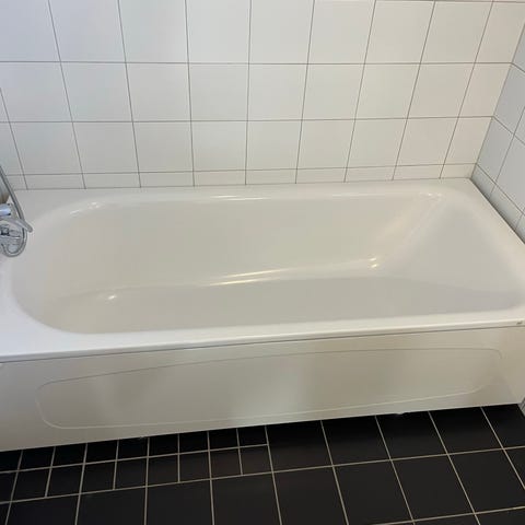 Okänd Tillverkare Badkar med kromade tassar. Badkaret har en klassisk design med höga tassar i krom och är avsett för badrum. Produkten är tillverkad av material som ger en vit yta och passar för installation i badrum med kaklade väggar och golv.