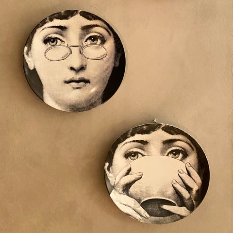 Fornasetti tallrik set bestående i svartvitt porslin. Varje tallrik har ett unikt ansiktsmotiv med olika uttryck.