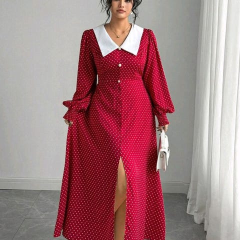Röd klänning med vita prickar, långa ärmar och vit krage. Klänningen har en vit volang nedtill och resår i midjan.