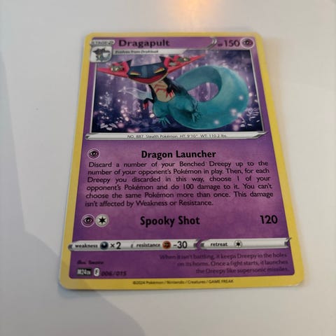 Pokémon Dragapult VMAX samlarkort med illustration av Dragapult i full färg. Kortet har olika symboler och text som beskriver dess egenskaper och attacker i spelet.