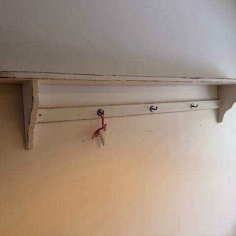 Gammal indisk vägghylla med monterade krokar under.