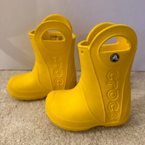 Crocs barnstövlar för flicka i storlek 30 (US C13). Stövlarna är rosa och tillverkade i Crocs karaktäristiska material som är vattentåligt och lätt att rengöra. Designade med handtag för enkel på- och avtagning.