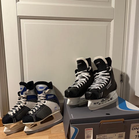 Bauer Supreme ishockeyskridskor i storlek 42, svart färg. Passar för ishockey och är tillverkade med material anpassade för sporten.
