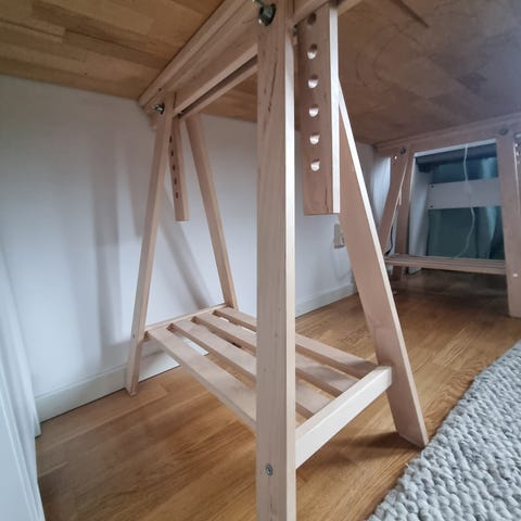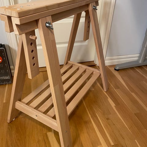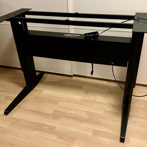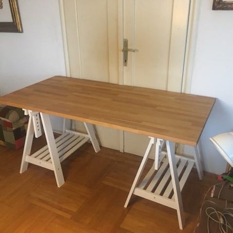 Säljer IKEA bord/skrivbord: LAGKAPTEN bordsskiva 200x60 cm + 5 st OLOV höj-justerbara ben. Nästan nytt och i mycket bra skick. Stabilt med 5 ben – perfekt som skrivbord, arbetsbord eller hobbybord.