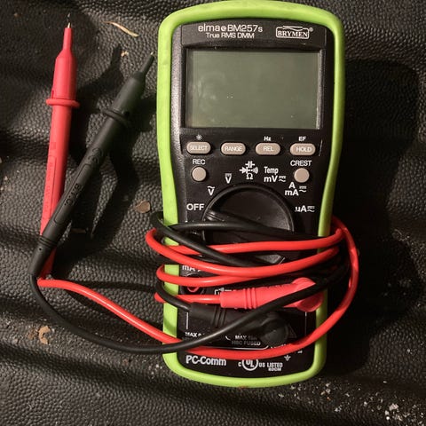 Digital multimeter i gul färg. En handhållen enhet för mätning av elektriska värden.