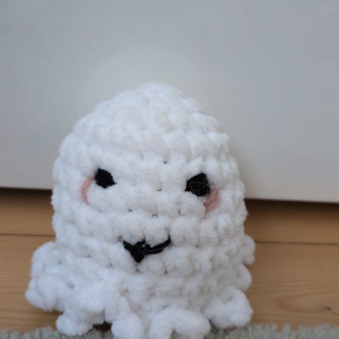 Virkat spök gosedjur i vitt fluffigt garn och med handsydda ansiktsdetaljer.