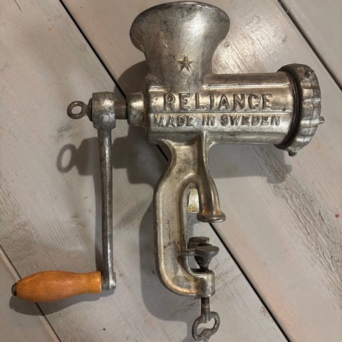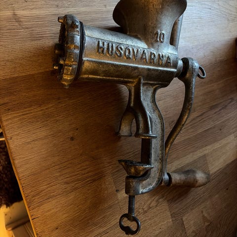 Husqvarna no 10, Reliance, köttkvarn med tre korvstoppnings tillbehör 15 mm, 20 mm och 25 mm diameter. Allt sparsamt använt och i mycket gott skick. Idealisk för att göra egen korv. Smaskens!