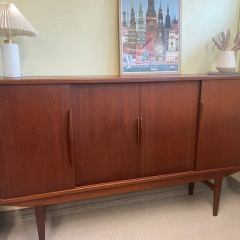 Skänk i teakfanér från ca 1950–60-tal med skjutdörrar upptill och lådor nertill.