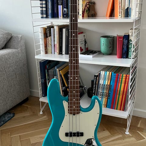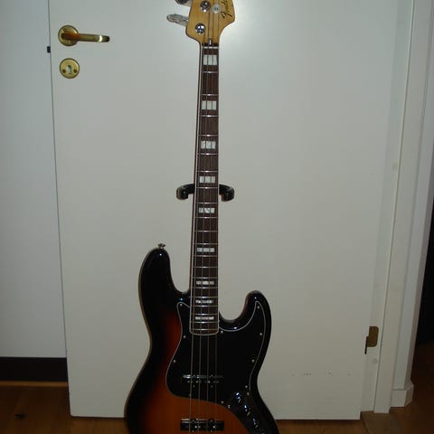 Metallic Sherwood Green with matching headstock, white pearloid pickguard, maple neck with rosewood fretboard and white pearloid block inlays. Two custom shop jazz bass pickups. Vintage style lollipop tuners. In original case. Excellent condition and very seldom used since purchase. Bought second-hand on e-bay from the US in 2021.