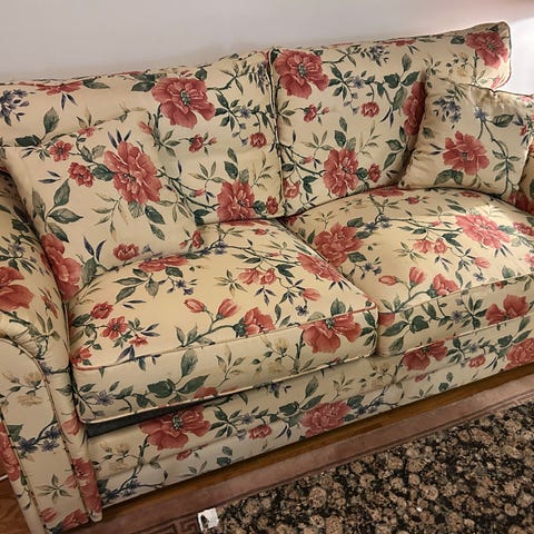 Soffa med mönstrat tyg och trästomme