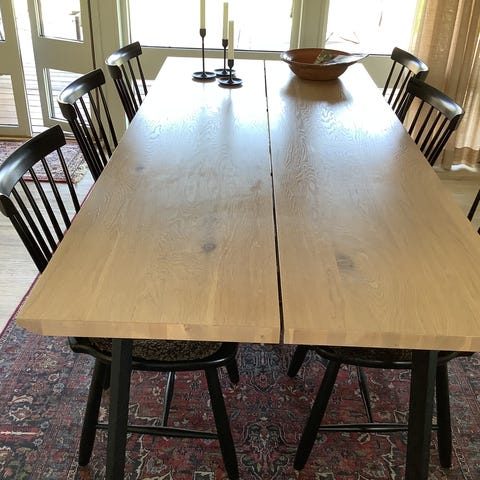 Mindre repor/märken på bordsskiva. Nyansskillnad mellan bordskiva och iläggsskiva (se bilder) Inget vi stört oss på då vi använt duk dom gånger vi förlängt bordet. Säljes p.ga. Platsbrist