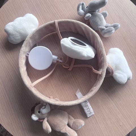 Mjuka fina figurer i form av mus, ko, två stjärnor och en spegel i mitten (solen) riktad neråt så att barnet kan se sig själv. Inklusive arm och speldosa. Fästet passar det flesta sängar och vaggor.