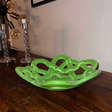 Kosta Boda skål med dekorativa svarta mönster på grön bakgrund. Tillverkad i glas med rund form och konstnärlig design av Ulrica Hydman Vallien. Ett unikt objekt från serien Caramba!