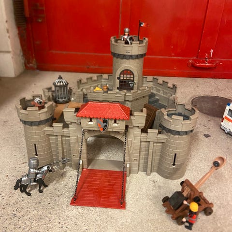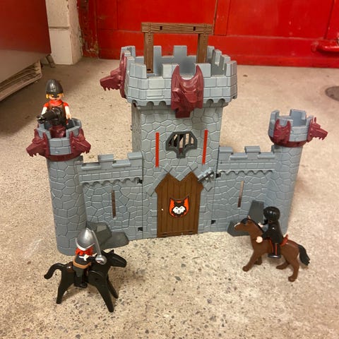Playmobil slott och fort barnleksaker inklusive flera figurer och tillbehör. Setet består av två byggnader i grått och svart med gröna detaljer, samt olika figurer och djur. Lämpligt för barn och samlare som är intresserade av medeltida teman.