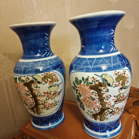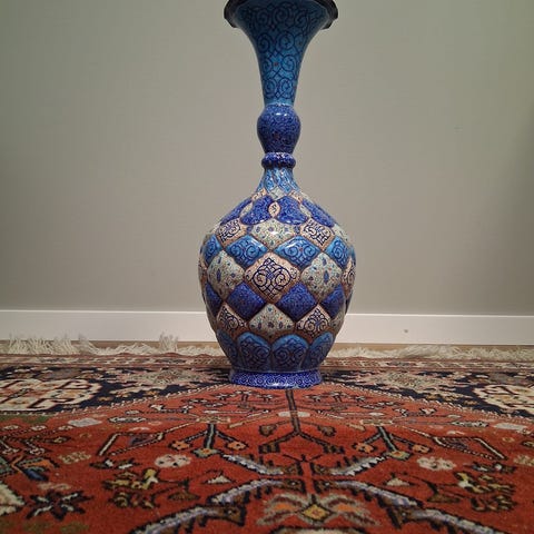 Handgjorda blå emaljerade vaser och fat med detaljerade mönster. Vaserna har en vriden design och är cirka 30 cm höga. Fatet har en blomformad design och en diameter på cirka 35 cm. Passar som dekorativa föremål.