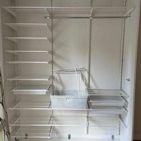2 st Elfahyllor med tillhörande konsoler, klädstång och väggskenor.