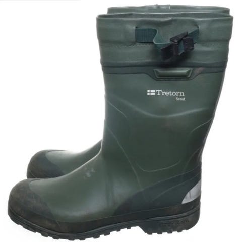 Tretorn gummistövlar i storlek 44, svarta. Tillverkade för att vara vattentäta och lämpade för användning i blöta och leriga miljöer. Stövlarna har en justerbar snörning upptill för bättre passform.