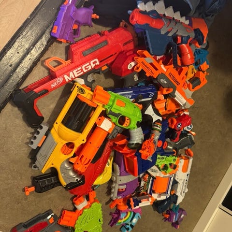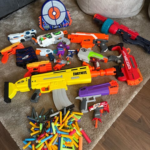 Vi säljer 4 stycken Nerfs och 1 styck X-shot. Alla funkar bra, några är nästan helt nya.