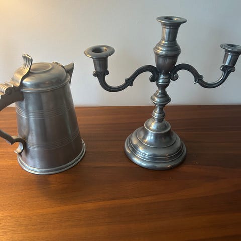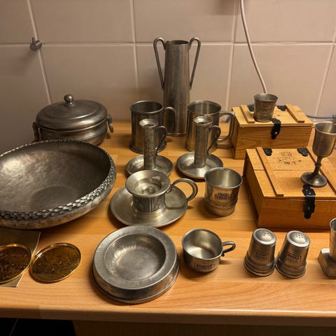 Material och Märkning: Liknande föremål är ofta tillverkade av tenn, ibland märkt "HANDSTOPT TPB TINN" eller "NORGE" på undersidan.
