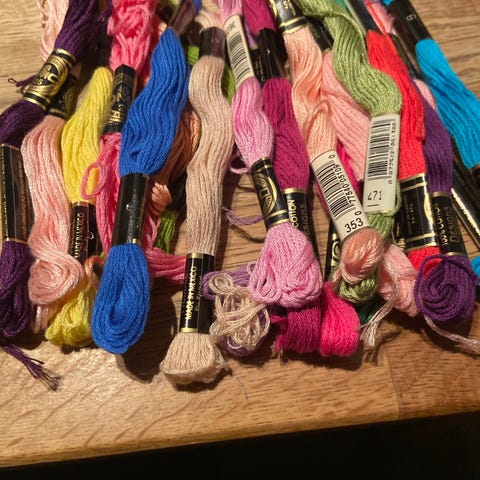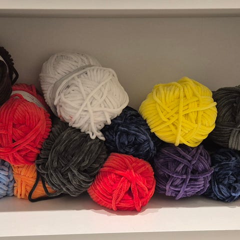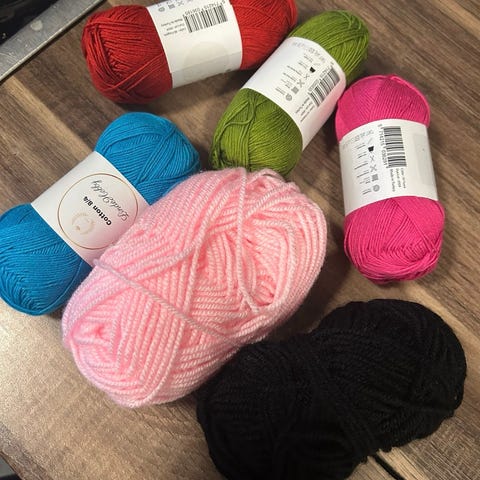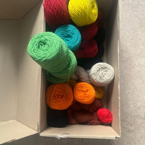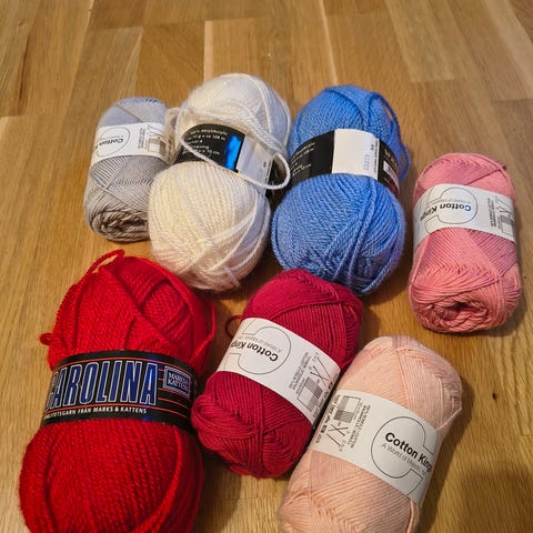 Garnpaket med olika färger och material. Innehåller flera nystan i varierande storlekar och färger bl a;