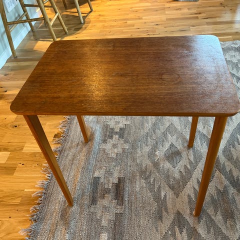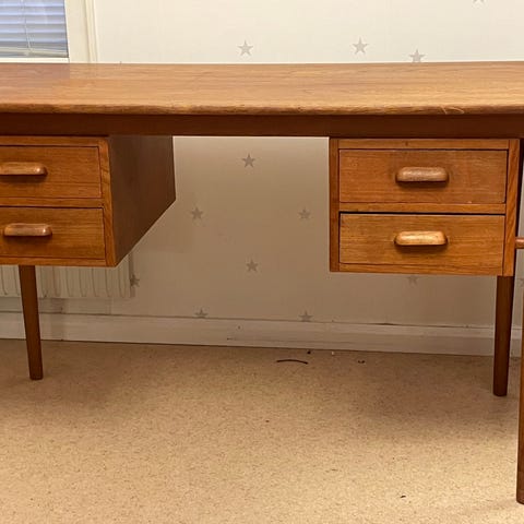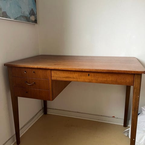 Sött litet skrivbord för barn. Charmigt som det är men kan bli ännu finare med lite kärlek. Idag vitmålat men det finns teakfaner under färgen som säkert går att skrapa fram (färgen flagnar lätt) eller så målar man det vitt. Har många år på nacken och därmed en del skador. Skivan har slagit sig och det finns skador på båda gavlarna där faneren släppt.