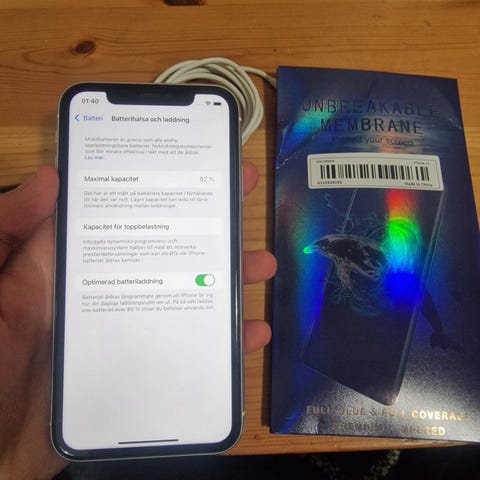 73% batterihälsa. Laddare och kartong medföljer inte. Man kan behöva headset vid samtal då det hamnat skräp I utgången. Går ordna hos någon som kan.