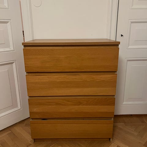 En klassisk malmbyrå med 4 lådor från IKEA. En vattenfläck i en av lådorna (se sista bilden) men annars i fint skick.