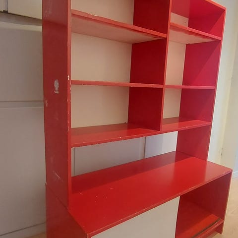 Bokhylla med lådor samt skåp.