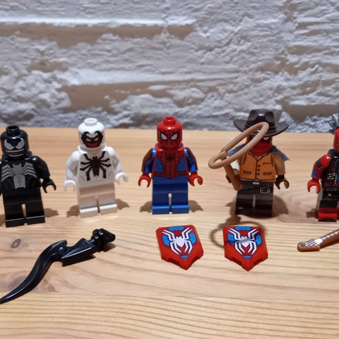 LEGO Spider-Man byggsats med flera minifigurer och tillbehör. Innehåller detaljerade figurer och delar för att bygga scener från Spider-Man-temat.