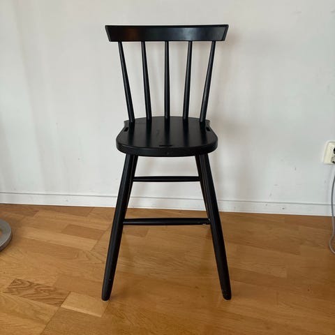 Mycket stabil pinnstol i trä, äldre modell köpt på auktion. Sitthöjd 34 cm. Totalhöjd 64 cm.
