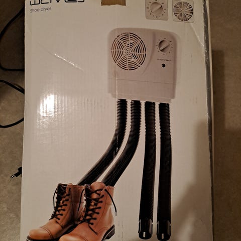 350 watt, timer för två timmar, överhettningsskydd, kan användas för torkning av två eller fyra blöta skor/stövlar samtidigt.