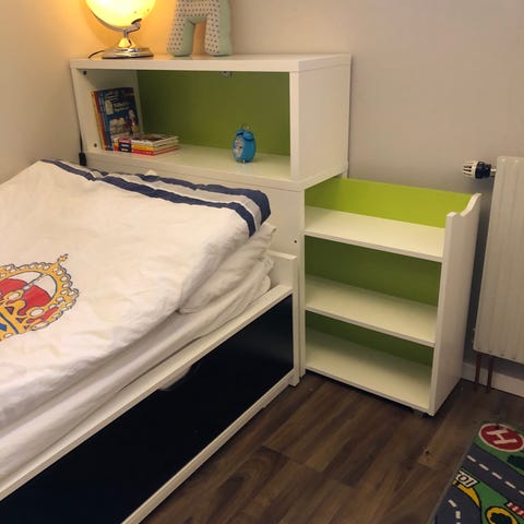 Sängen är från början en våningssäng och detta är överdelen. Underdel finns ej kvar men den är perfekt för att krypa ut längs med nedtill.