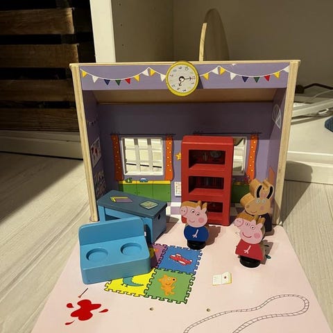 Greta Gris dockhus med tillhörande möbler och figurer. Innehåller ett dockhus i flera våningar med olika rum samt mindre möbler och två figurer från serien.