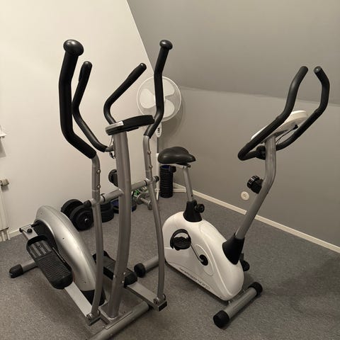 Träningscykel i svart färg. Utrustad med digital display med funktioner för mode, inställning och återställning. Designad för inomhusträning.