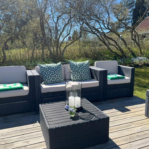 Det är inte alla originalkuddar som finns kvar, det är lite blandat. Utan ser ut som på bilden. Blommiga kuddarna hänger ej med.