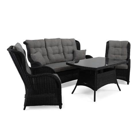 Utemöbelset bestående av två stolar, en soffa och ett bord, tillverkade i rottingmaterial. Setet inkluderar mörkgråa dynor för sittkomfort. Passar för utomhusbruk och erbjuder sittplatser för flera personer.