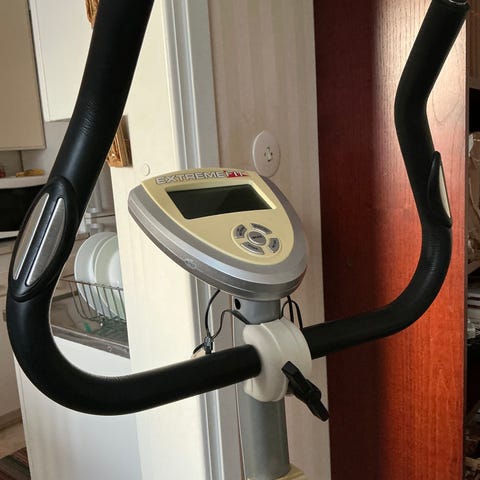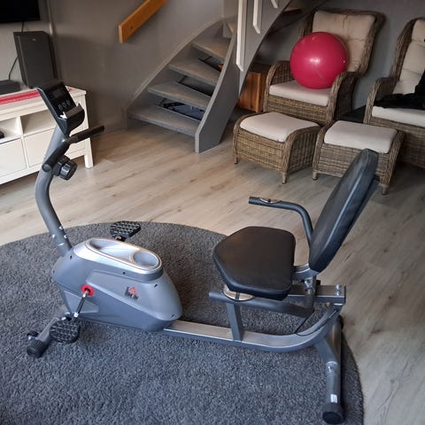 Motionscykel med flera träningsprogram. Utrustad med en display för att visa träningsdata och handpulssensorer. Maskinen är designad för hemmabruk och erbjuder en tyst och jämn gång. Grå färg och robust konstruktion. Inköpt 2008.