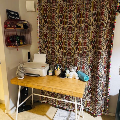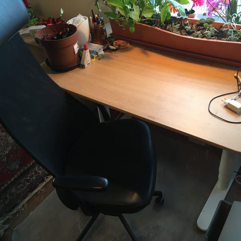 Skrivbord som min pappa designat själv. Den är i högtryckslaminat och därmed mycket fukt och reptålig: underrede i borstad rostfrittstål. Man kan skruva fast toppskivan i benen men jag har använt den lös och ingenting har häntmed tanke på att den är tung. Skruvar ingår ej men man kan skruva den med vanliga skruvar.
