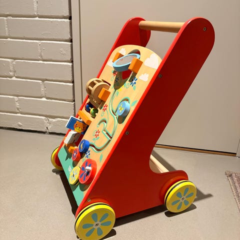 Lära-gå-vagn som inte kommer till användning längre. Använd av ett barn.