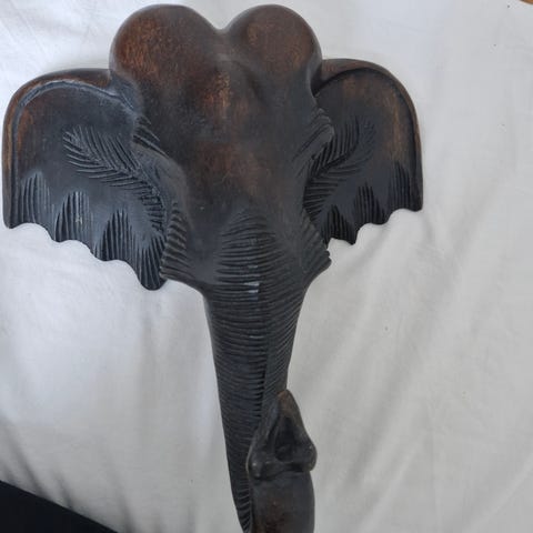 Stor och vacker handgjord elefant i massivt trä, inköpt i Thailand. Gediget hantverk med fina detaljer och naturlig patina. Fristående skulptur med lyft snabel – symbol för tur och styrka. Unik och ej massproducerad.