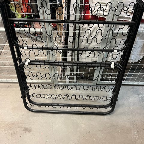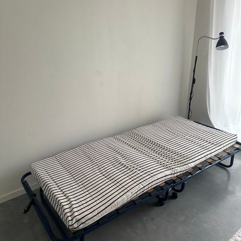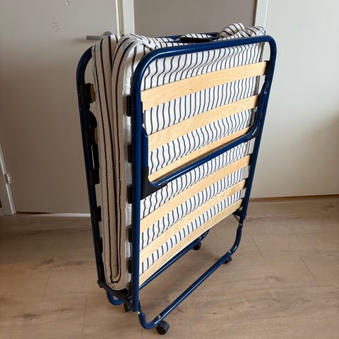 Stål. 7 cm tjock madrass med kärna av polyeterskum. Med trälameller. Hopfällbar. B80 x L190 x H33 cm