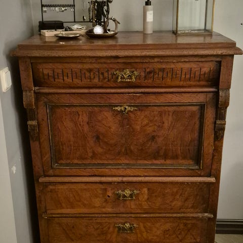 Möbeln är använd och har tydligt ytslitage, märken i fanér samt mindre sprickor. Den säljs därför som ett renoveringsobjekt / projekt. Alla lådor och klaff fungerar, men skicket är överlag slitet.
