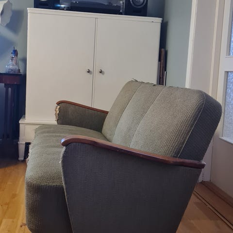 Från Arne Norell i Aneby. Klädd i kraftigt bomullstyg. Soffan har mindre skador på vänster armstöd och underrede. Fåtöljen har skada på höger armstöd. Se bilder.