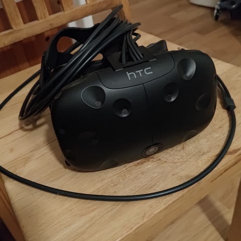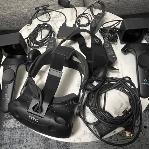 HTC Vive VR-headset med tillbehör inklusive handkontroller och sensorer. Används för virtuell verklighet och spelupplevelser. Till PC.