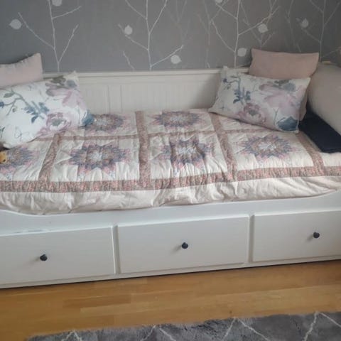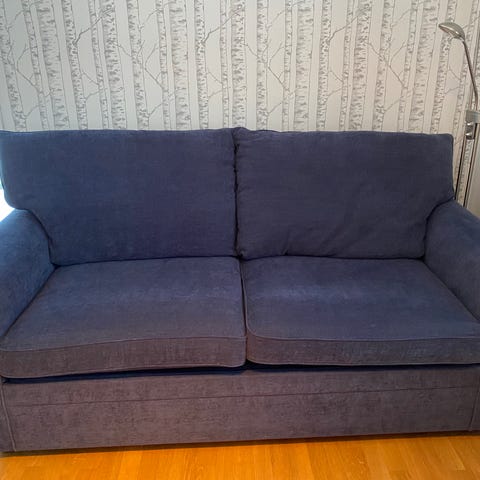 Grön bäddsoffa med två sittdynor och två ryggdynor. Soffan har armstöd på båda sidor och förvaring för sängkläder bakom ryggdynorna .Passar för vardagsrum och gästrum. Den är skön att sitta i. Sängen när den är utbäddad är 2m lång och 1,15 cm bred