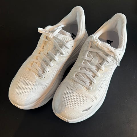 Hoka Clifton löparskor i storlek 40 2/3. Skorna är designade för löpning och har en lätt och ventilerande ovandel. Sulan har ett mönster som ger grepp och stöd vid löpning.