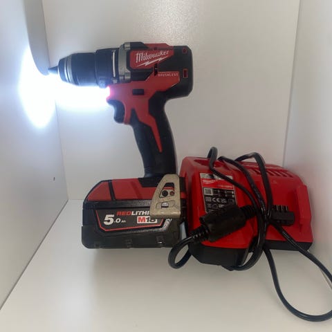 Milwaukee M18 Slagskruvdragare och borrmaskin 2-pack med tillhörande batterier och laddare. Verktygen är batteridrivna och avsedda för professionellt bruk inom bygg och hantverk.