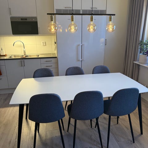 Följer även med 6 stolar, dock rangliga så åtspänning av skruvarna kanske hjälper. Det finns även färgskav på stolarna.