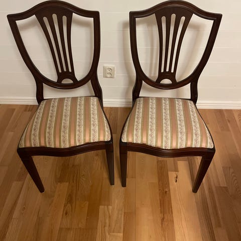 6 st välvårdade stolar i antikek. Medföljer även ett grått överdrag som enkelt går att ta av och på. Pris 500.- st